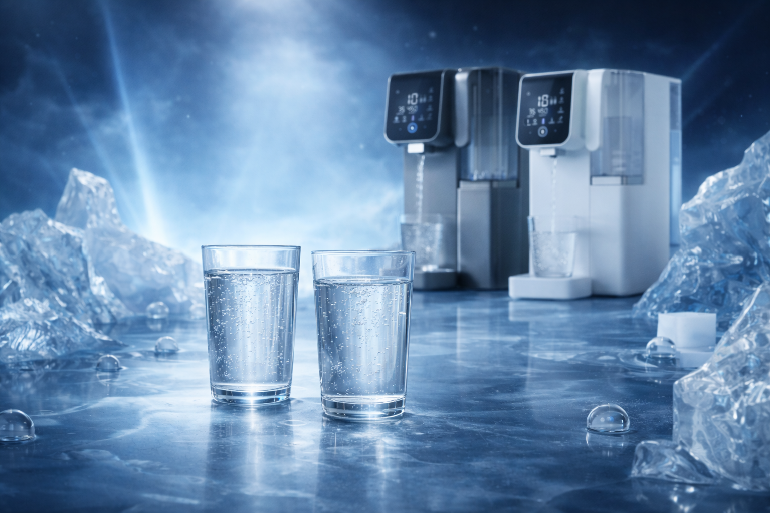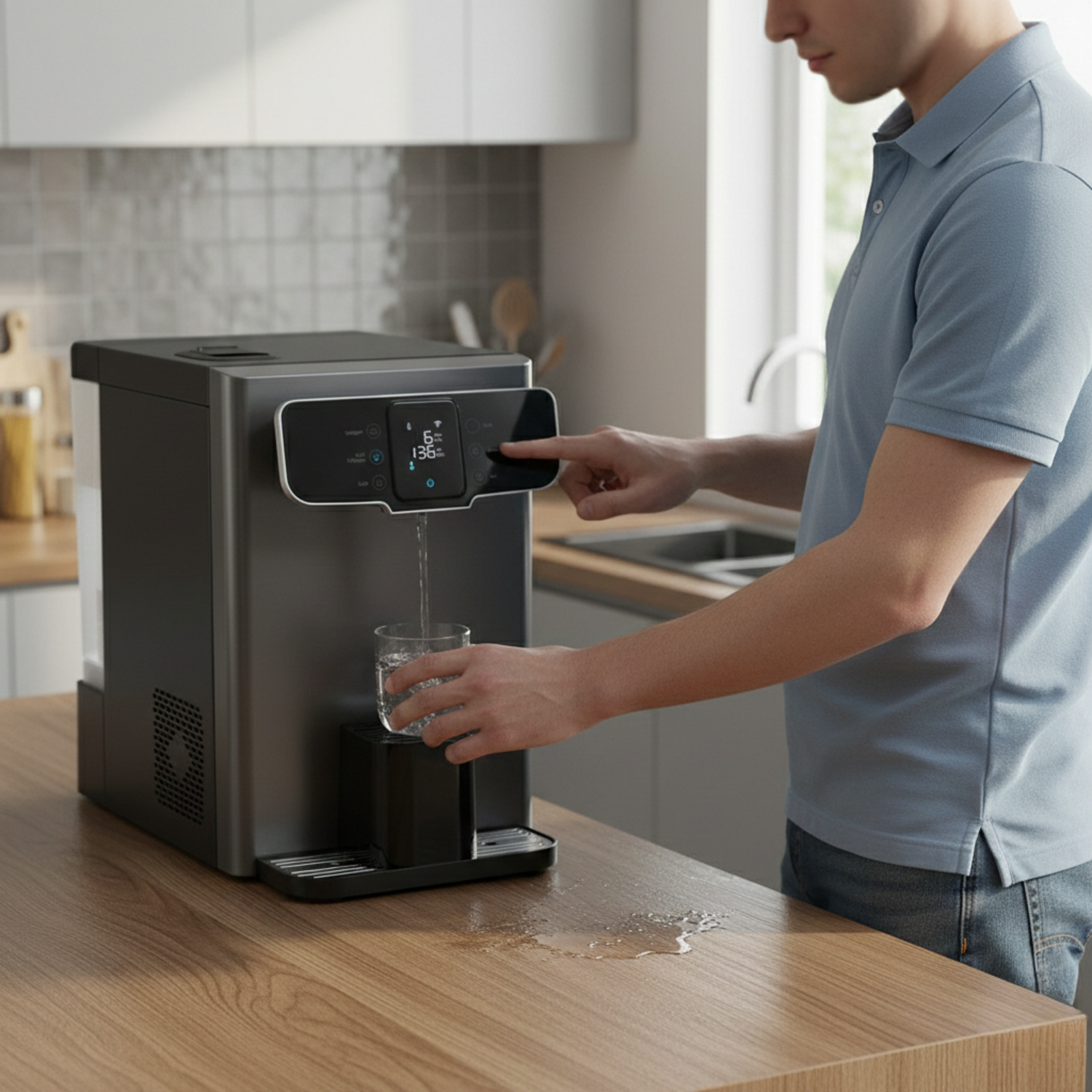 Système de comptoir avec réservoir intégré, permettant de produire et stocker de l’eau filtrée sans raccordement.